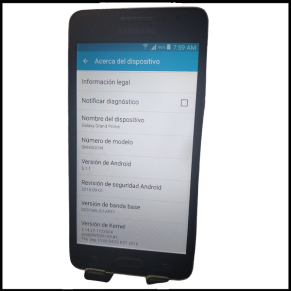 El Samsung Galaxy Grand Prime es un smartphone Android orientado a selfies, gracias a una cámara frontal de 5 MP de amplio ángulo. Entre sus características más destacadas posee una pantalla qHD de 5 pulgadas, procesador quad-core Snapdragon 400, 1GB de RAM, 8GB de almacenamiento interno, cámara trasera de 8 MP, y corre Android 5.1.1 Lollipop.